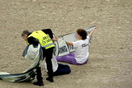 Anki och Frida från NEJ-kampanjen i ett nytt demokratiprojekt, Olydig Folkomröstning, stormade Gothenburg Horse Show mitt under TV-sändningen, la ut en banderoll på manegen och låste därefter fast sig i varandra.
