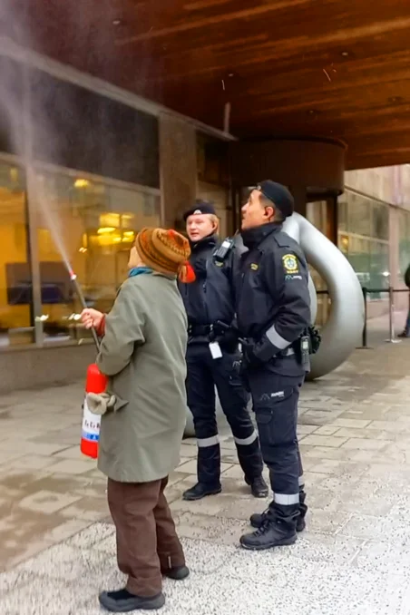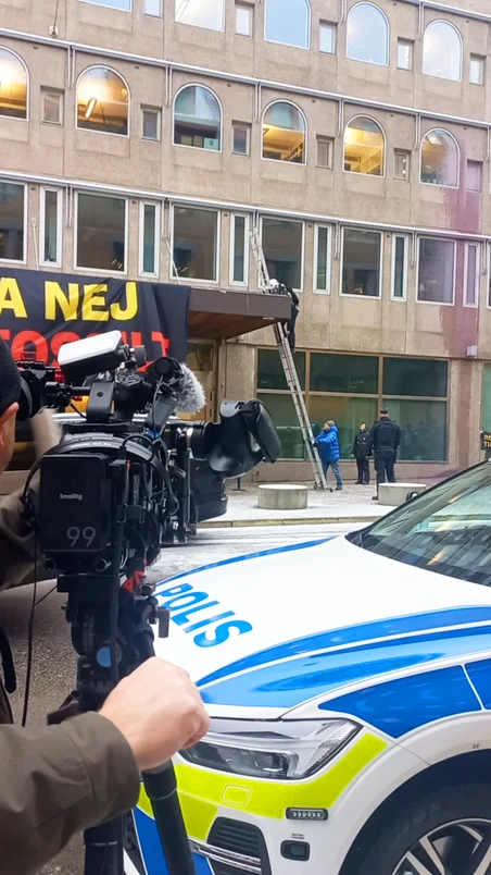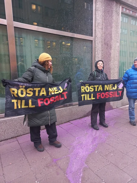 Under förmiddagen den 22/01 gjorde vi en sprayaktion mot Finansdepartementet i Stockholm. Fyra kvinnor i åldrarna 28 till 78 år deltog i aktionen. Gruppen företräder NEJ-kampanjen för demokratiprojekt Olydig Folkomröstning.