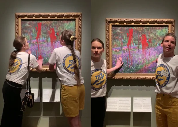 En sjuksköterska och en sjuksköterskestudent, Emma Fritzdotter och Maj Udikas, smetade röd färg på skyddsglaset till den berömda Monet-tavlan "Trädgården i Giverny" på Nationalmuseum i Stockholm. Därefter limmade de fast sig på glaset. Åtalspunkten är skadegörelse med ett skadeståndsanspråk på 181 149 kronor. Tavlan skadades inte av aktionen.